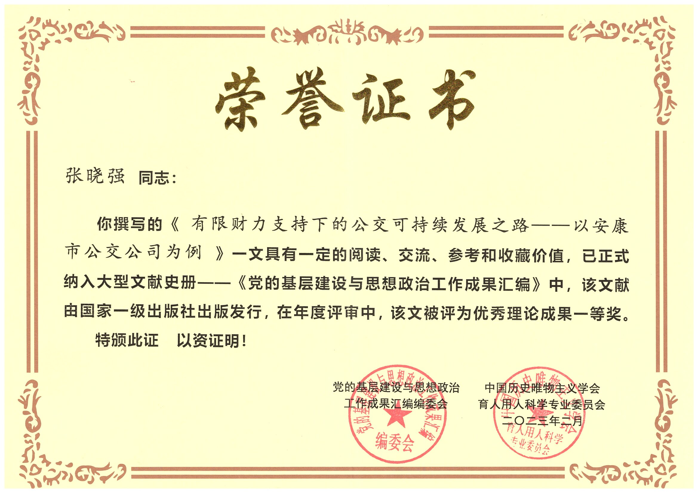 該文章由安康市公交公司黨委書記、董事長張曉強撰寫,從安康中心城區(qū)公共交通現狀、安康地面公交面臨的機遇和挑戰(zhàn)等三個方面,就如何在有限財力支持下走可持續(xù)發(fā)展之路進行探研究,并提出推進公交健康發(fā)展建議。文章具有一定的閱讀、交流、參考和收藏價值,在年度評審中,被評為優(yōu)秀理論成果一等獎。